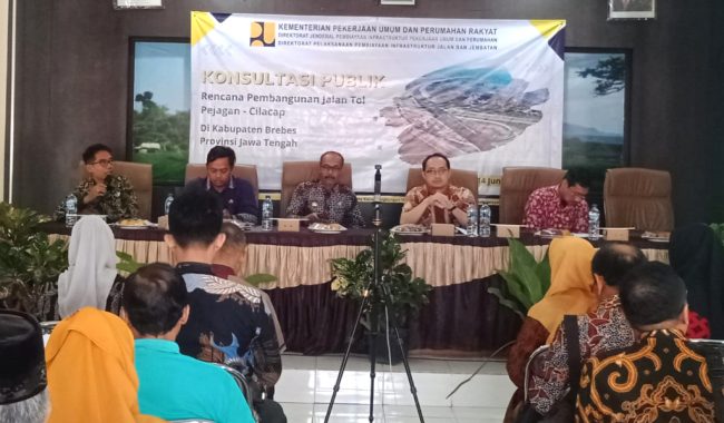 BREBES, smpantura – Tahapan pembangunan jalan tol Pejagan-Cilacap, terus berjalan. Jumat (14/6), Kementerian PUPR menggelar konsultasi publik rencana pembangunan jalan tol tersebut di aula Kantor Kecamatan Tonjong, Brebes.
