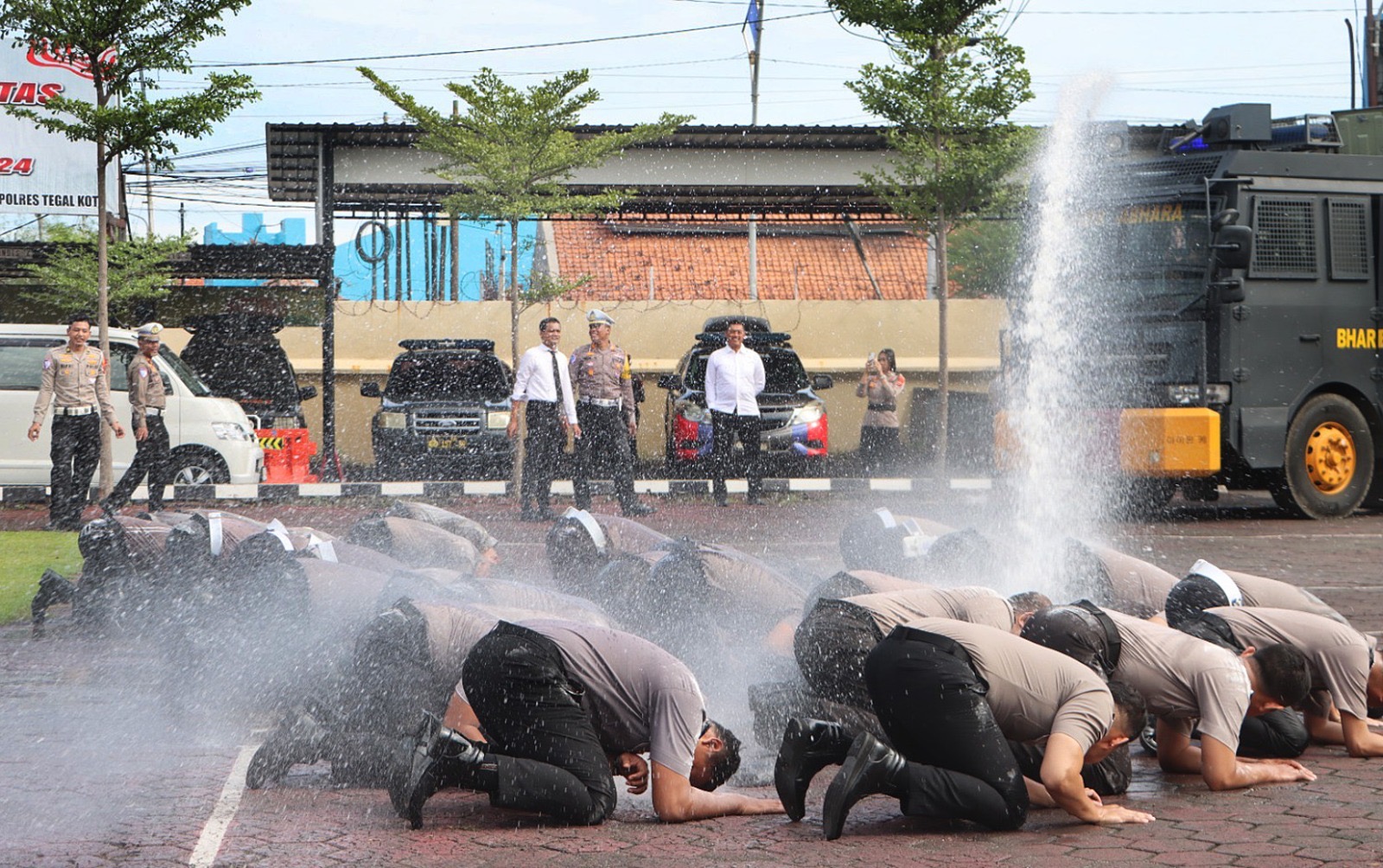 TEGAL, smpantura – Peristiwa menarik, terjadi di penghujung 2024. Itu terjadi ketika 32 personel Polres Tegal Kota, disemprot air cukup kencang, dari mobil Water Canon, yang biasa digunakan untuk membubarkan massa pendemo atau memadamkan kebakaran, Selasa (31/12).