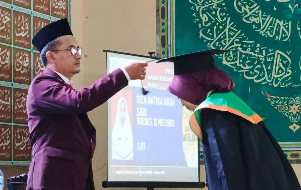 BREBES, smpantura – Sebanyak 63 mahasiswa Akademi Keperawatan (Akper) Al Hikmah 2 Benda, Kecamatan Sirampog, Kabupaten Brebes, mengikuti wisuda dan angkat sumpah profesi perawat, Selasa (14/10/2025). Kegiatan berlangsung di Gedung Olahraga Pondok Pesantren Al Hikmah 2.