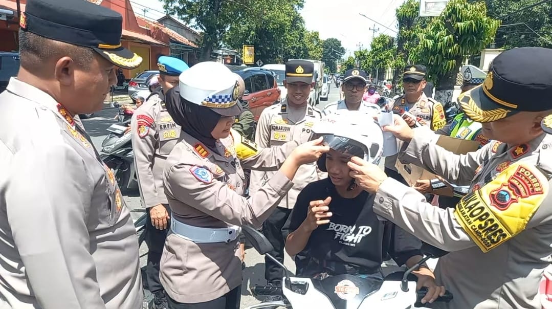 SLAWI, smpantura – Kapolres Tegal, AKBP Andi M Indra Waspada Amirullah membagikan helm gratis kepada pengguna jalan dalam Operasi Keselamatan Lalu Lintas Candi 2025.