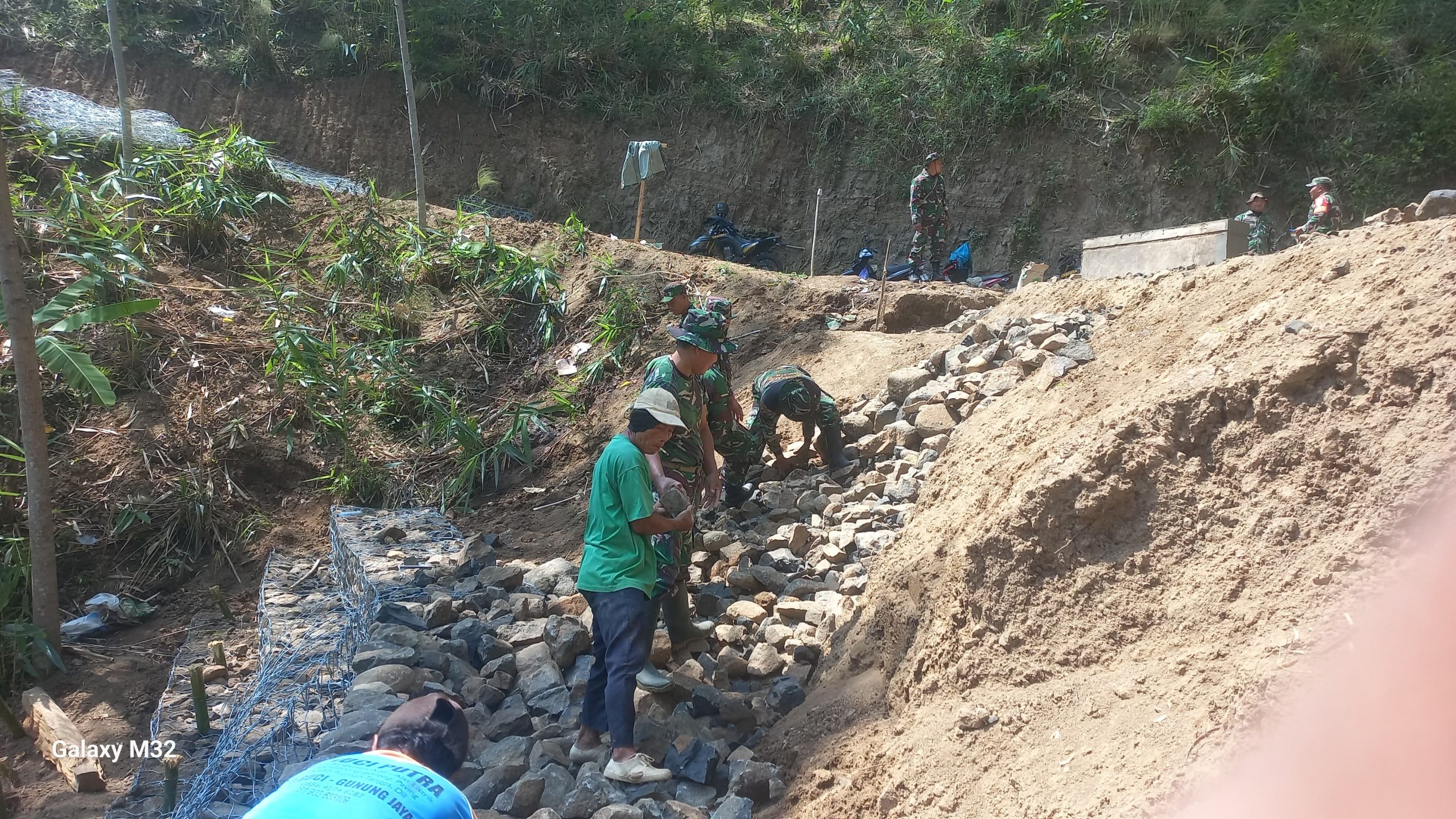 Nampak Danramil 12/Watukumpul Kodim 0711/Pemalang Letda Munawir di tengah-tengah Satgas dan warga ikut turun langsung bahu-membahu menata dan merapikan batu, Senin (21/10).