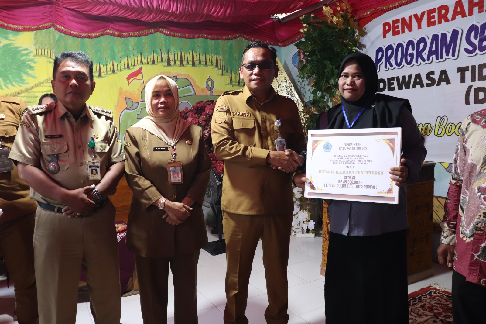 BREBES, smpantura – Pemkab Brebes mulai menyalurkan program bantuan Dewasa Tidak Sekolah (DTS). Penjabat (Pj) Sekda Brebes, Tahroni menyalurkan bantuan ini secara simbolis di Pusat Kegiatan Belajar Masyarakat (PKBM) Bina Sejahtera Desa Sigambir, Kecamatan Brebes, Selasa (22/7/2025).
