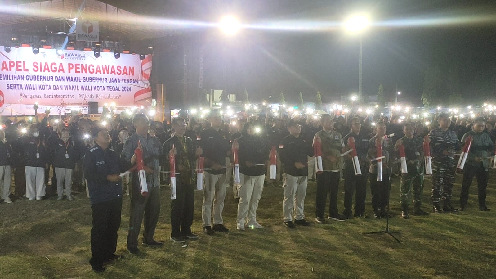 TEGAL, smpantura – Jajaran Badan Pengawas Pemilu Kota Tegal menggelar apel siaga pengawasan pemilihan Gubernur Jawa Tengah dan wali kota Tegal yang diikuti 400 orang di Lapangan Tegal Selatan, Jumat malam (8/11/2024).