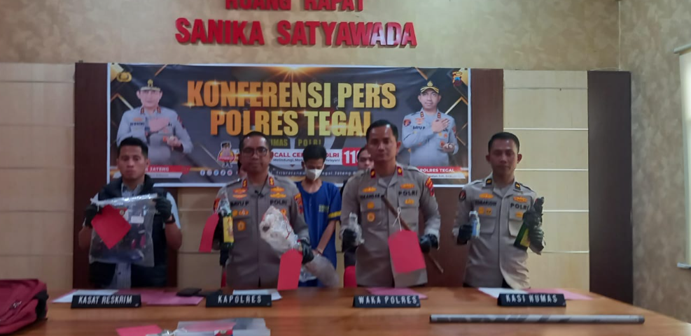 “Kami mengamankan yang bersangkutan pada saat kami mendapatkan info dari masyarakat yang mencurigai adanya beberapa orang yang menggunakan kendaraan roda tiga,” jelas Kapolres Tegal AKBP Bayu Prasatyo pada konferensi pers di Ruang Sanika Satyadawa, Jumat (19/9).