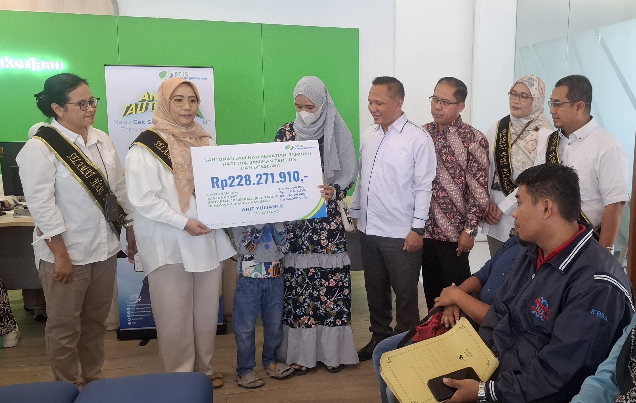 TEGAL, smpantura – Badan Penyelenggara Jaminan Sosial (BPJS) Ketenagakerjaan Cabang Tegal, menyerahkan santunan sebesar Rp 228.271.910 kepada ahli waris pekerja PT Cita Contrac, Desa Karanganyar, Kabupaten Tegal.