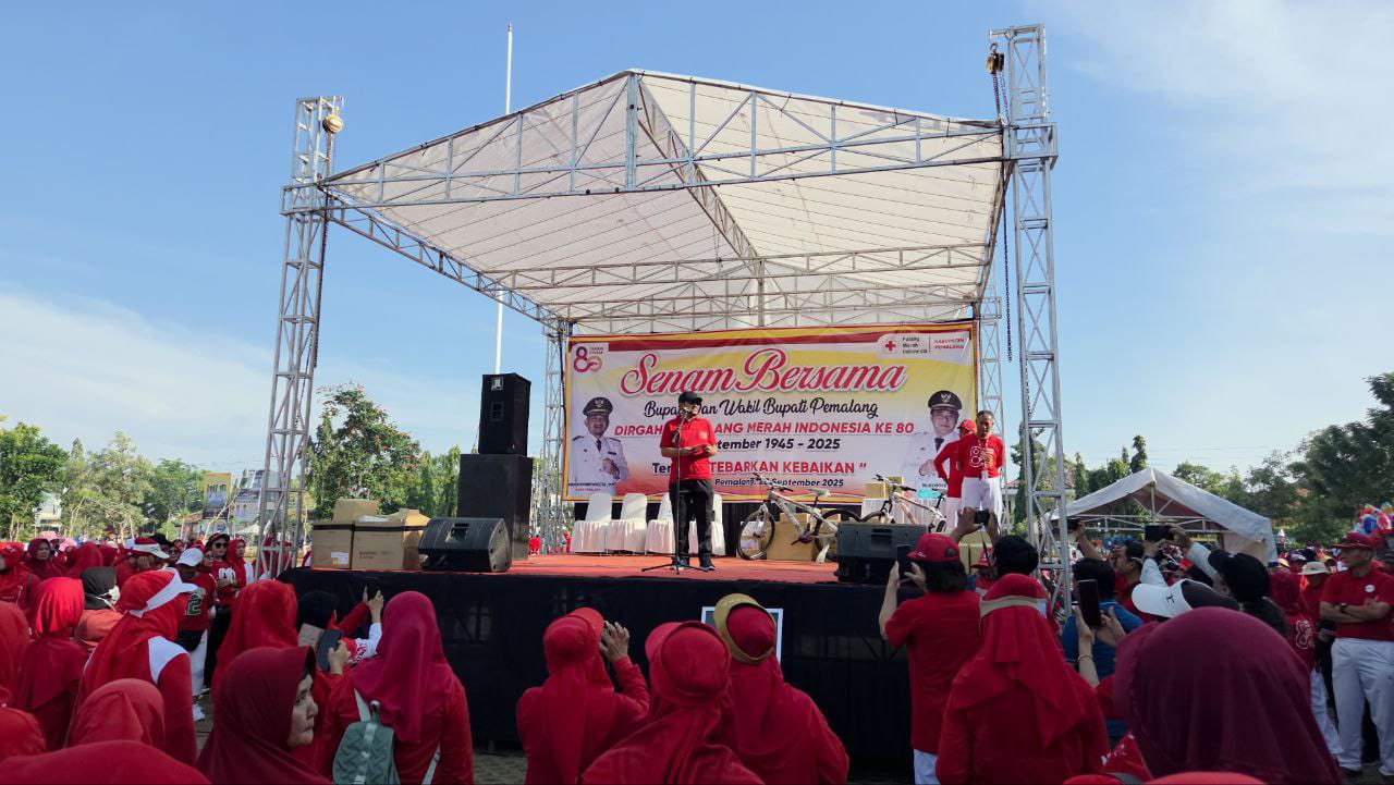 PEMALANG, smpantura – Pada hari ulang tahun Palang Merah Indonesia (PMI) ke- 80, Bupati Pemalang Anom Widyantoro berharap PMI bisa terus konsisten menjaga komitmennya dalam melayani tanpa membeda-bedakan. Harapan tersebut disampaikan usai dirinya bersama Wabup Pemalang Nurkholes dan masyarakat mengikuti senam bersama di Alun-alun setempat.