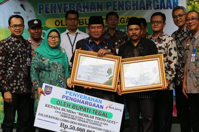 SLAWI, smpantura – Bupati Tegal Umi Azizah menyerahkan penghargaan pemenang lomba desa wisata kepada Badan Usaha Milik Desa (BUMDes) Berkah Tirto Guci. Penghargaan berupa uang Rp 50 juta secara simbolis diserahkan Bupati Tegal di Curug Serwiti Guci, Selasa (2/1/2024).