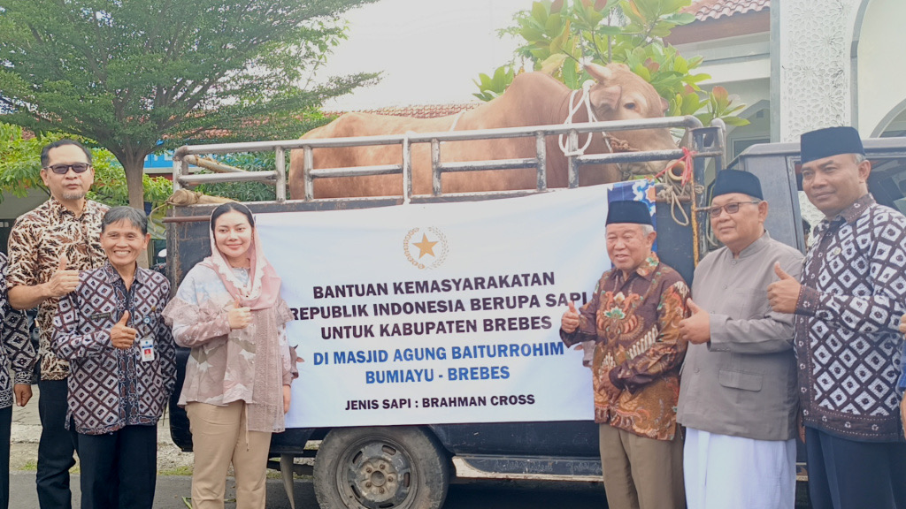 “Atas nama Presiden Prabowo Subianto saya serahkan sapi untuk panitia kurban Masjid Agung Baeturrohim Bumiayu supaya dibagikan secara merata kepada warga,” kata bupati.