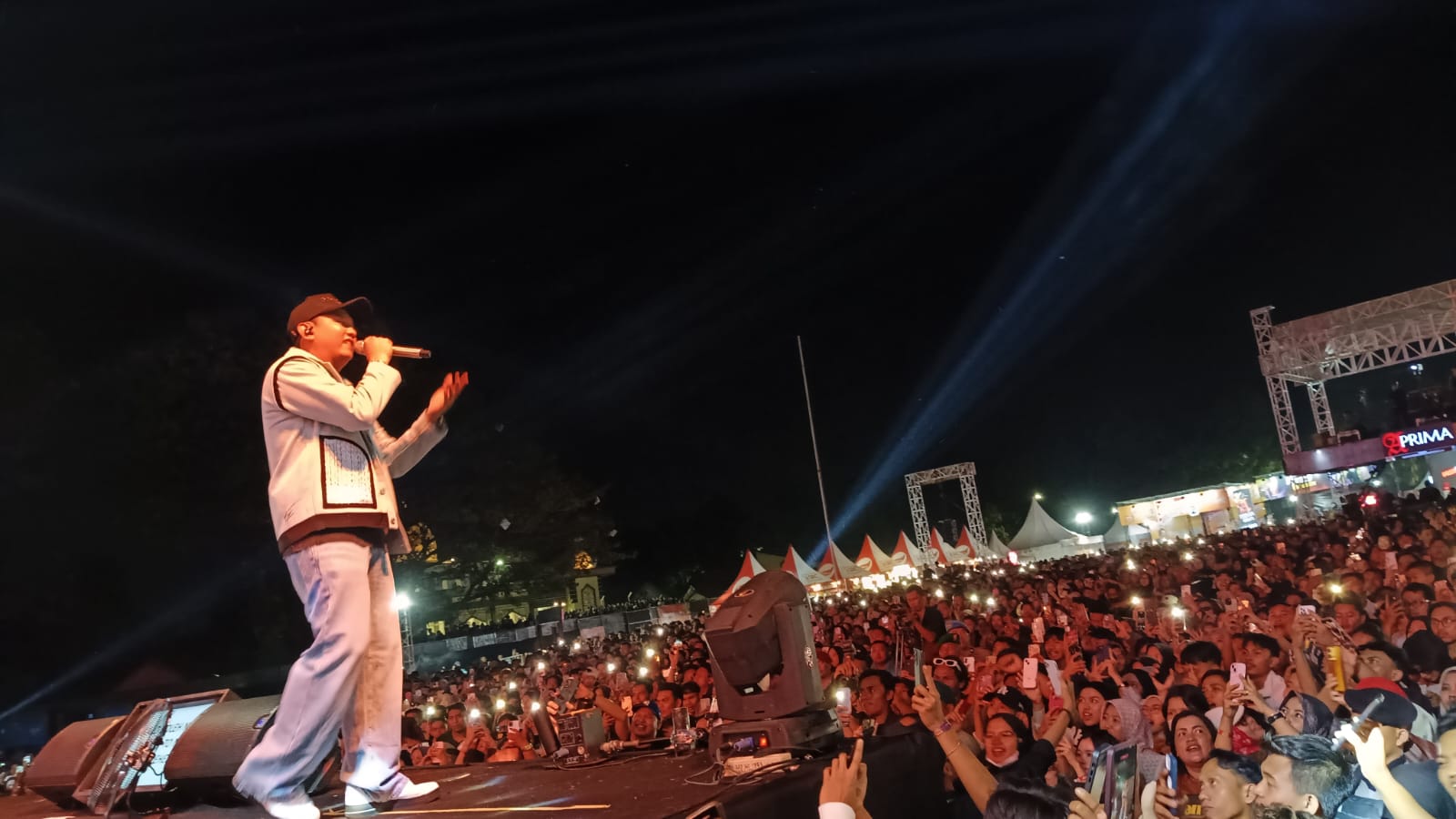 SLAWI, smpantura – Ribuan warga Kabupaten Tegal dan sekitarnya tumplek blek di lapangan Aspol Kalibliruk Slawi, Jumat malam (18/7/2025). Mereka tak terhanyut dalam penampilan apik Denny Caknan, NDX AKA, Guyon Waton dan artis-artis lainnya yang terbalut dalam Nuansa Ceria. Bahkan, Bupati Tegal H Ischak Maulana Rohman ikut jingkrak-jingkrak menikmati ambyarnya penampilan artis-artis tersebut.