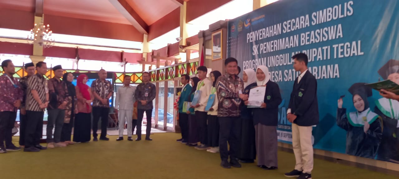 SK penerimaan beasiswa program unggulan Bupati Tegal Satu Desa Satu Sarjana (Sadesa) diserahkan kepada delapan mahasiswa yang akan menempuh kuliah di Sekolah Tinggi Ilmu Keguruan dan Ilmu Pendidikan Nahdlatul Ulama (STIKIP NU), Universitas Bhamada Slawi, Tegal Muhammadiyah University (TMU) dan Institut Agama Islam Bakti Negara (IBN) Tegal.