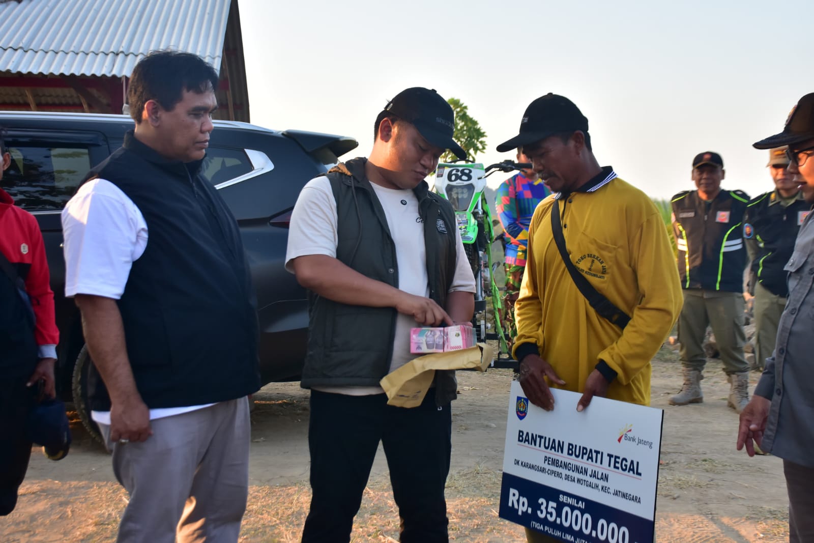 SLAWI, smpantura – Bupati Tegal, H Ischak Maulana Rohman bersama Wakil Bupati Tegal Ahmad Kholid menyerahkan bantuan uang tunai Rp 35 juta untuk membantu proses peningkatan jalan Dukuh Karangsari-Cipero di Desa Wotgalih, Kecamatan Jatinegara, Kabupaten Tegal, baru-baru ini. Bantuan tersebut merupakan hasil kerjasama Pemkab Tegal, Kodim 0712/ Tegal dan Bank Jateng.