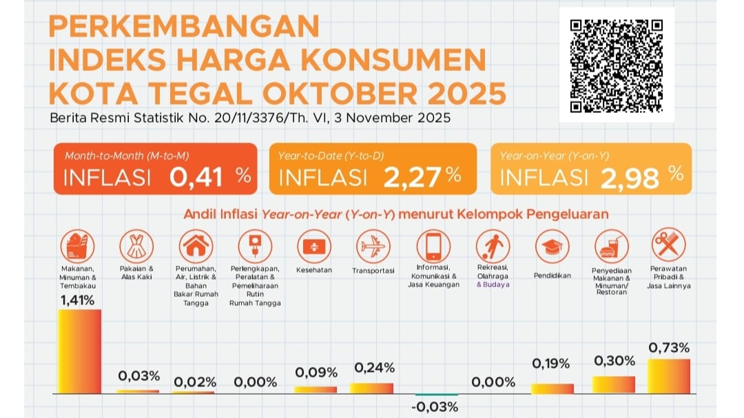 Badan Pusat Statistik Kota Tegal mencatat, pada Oktober 2025 inflasi year on year (y-on-y) mencapai 2,98 persen dengan Indeks Harga Konsumen (IHK) sebesar 110,01.