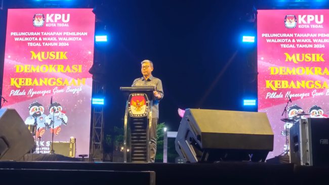 Hal itu disampaikan Dadang, saat memberikan sambutan pada acara peluncuran tahapan pemilihan wali kota dan wakil wali kota Tegal tahun 2024, yang diselenggarakan KPU Kota Tegal dengan kemasan konser bertajuk ‘Musik Demokrasi Kebangsaan’, di Jalan Pancasila, Sabtu (11/5) malam.
