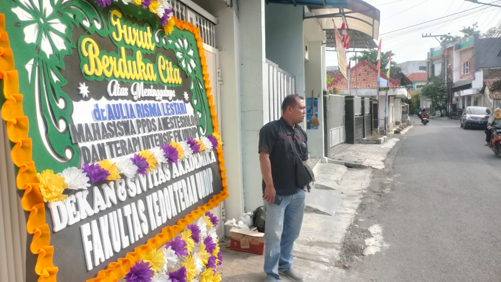 Sejumlah karangan bunga yang sebelumnya terpasang telah dipindahkan pihak keluarga, sehingga karangan bunga dari FK Undip terpampang jelas di depan rumah duka.