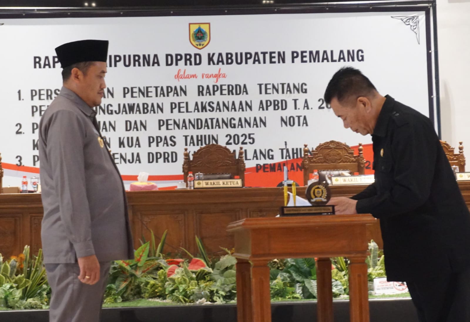 Selain Persetujuan dan penandatanganan nota kesepakatan KUA PPAS 2025, pada Rapat Paripurna, Rabu (31/7) kemarin ada dua pembahasan yang dilakukan yaitu Persetujuan Penetapan Raperda Tentang Pertanggungjawaban Pelaksanaan APBD TA. 2023 dan Penetakan Rencana Kerja (Renja) DPRD Kabupaten Pemalang Tahun 2026.(T08-Red)