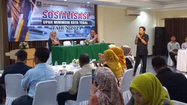 TEGAL, smpantura – Puluhan perusahaan di Kota Tegal, mengikuti sosialisasi Upah Minimum Kota Tegal tahun 2024 yang digelar Dinas Ketenagakerjaan dan Perindustrian (Disnakerin) setempat, di Hotel Bahari Inn, Kamis (7/12).