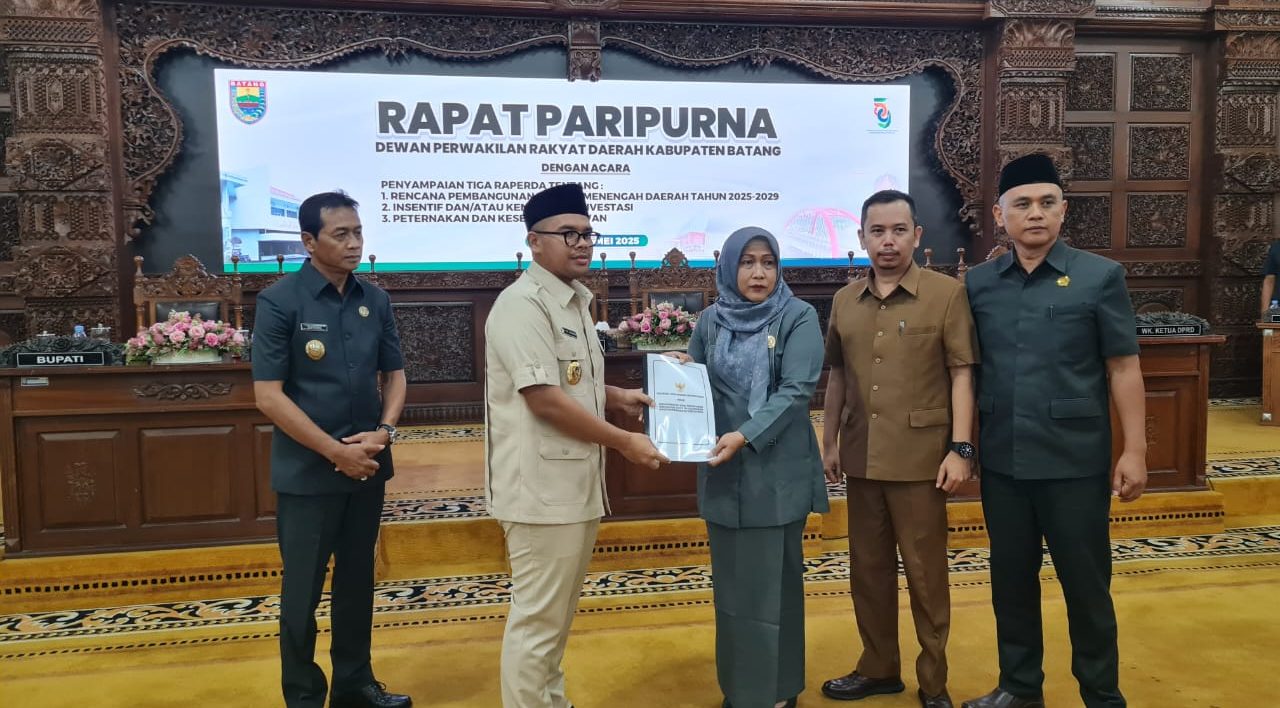 BATANG, smpantura – Bupati Batang M. Faiz Kurniawan menyampaikan tiga Rancangan Peraturan Daerah (Raperda) strategis dalam Rapat Paripurna DPRD Kabupaten Batang, Senin (19/5). Ketiga Raperda tersebut mencakup Rencana Pembangunan Jangka Menengah Daerah (RPJMD) Tahun 2025–2029, Insentif dan atau Kemudahan Investasi, serta Peternakan dan Kesehatan Hewan.