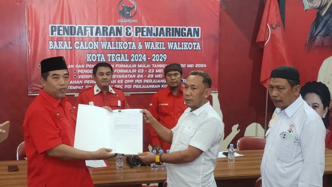 TEGAL, smpantura – Faruq Ibnul Haqi, mengambil formulir pendaftaran bakal calon wali kota Tegal, di DPC PDI Perjuangan Kota Tegal, Senin (6/5) sore.