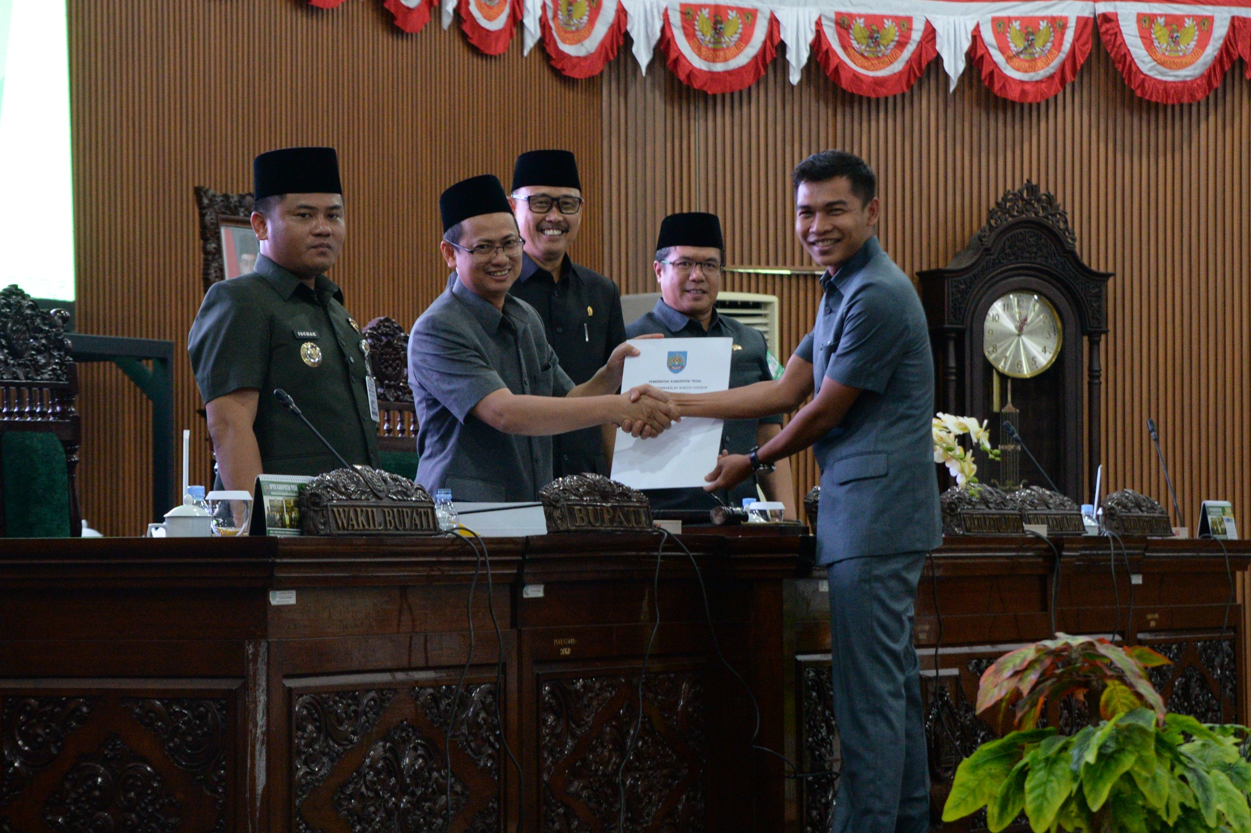 Anggota Fraksi PDI Perjuangan DPRD Kabupaten Tegal, Syahrul Mizan menyerahkan Pandangan Umum Fraksi PDI Perjuangan dalam Rapat Paripurna DPRD Kabupaten Tegal, Rabu 10 September 2025.