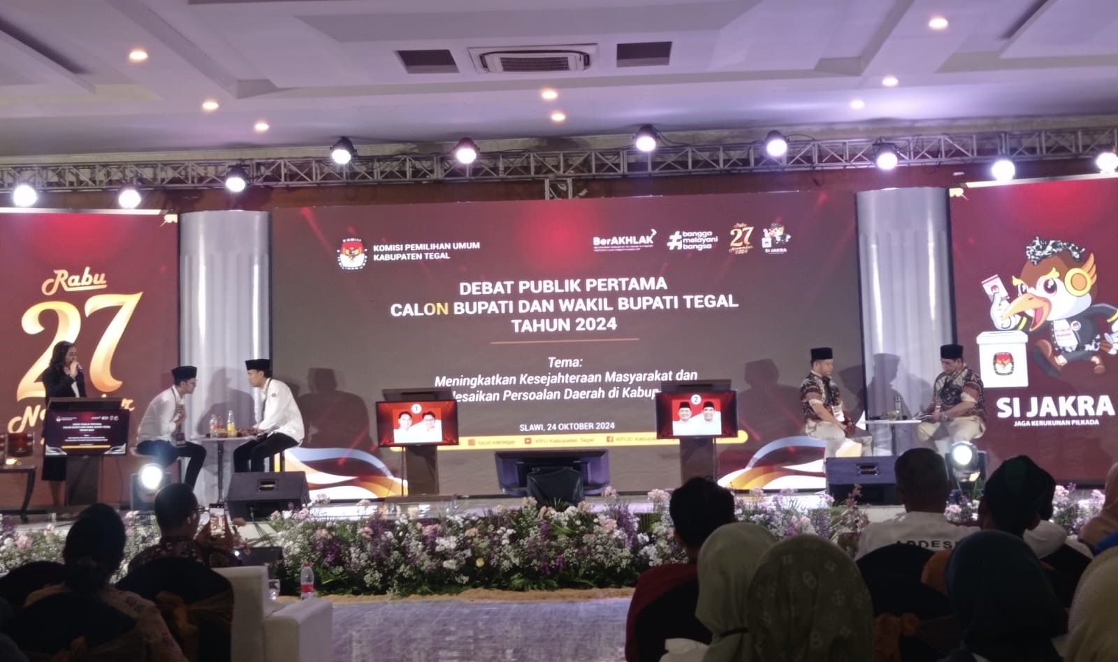 SLAWI, smpantura – Debat Publik Pasangan Calon (Paslon) Bupati dan Wakil Tegal yang digelar di Grand Dian Hotel Slawi pada Kamis (24/10), diwarnai aksi protes dari pendukung Paslon nomor 2 H Ischak Maulana Rohman dan Ahmad Kholid.