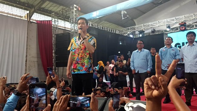 BREBES, smpantura – Calon Wakil Presiden (Cawapres) nomor urut 02, Gibran Rakabuming Raka, menyapa para petani di Brebes, saat mengunjungi Sekretariat Relawan Prabowo-Gibran (Progib) Kabupaten Brebes, di Klampok, Kecamatan Wanasari, Brebes, Senin (29/1/2024) sore. Kedatangan putra sulung Presiden Jokowi ini, mendapat sambutan antusias dari ribuan petani bawang, yang mayoritas menjadi relawan Progib tersebut.