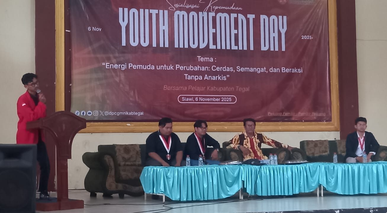 SLAWI, smpantura – DPC Gerakan Mahasiswa Nasional Indonesia (GMNI) Kabupaten Tegal menggelar Sosialisasi Kepemudaan Youth Movemnet Day di Gedung Yaumi Slawi, Kabupaten Tegal, Kamis (6/11/2025).