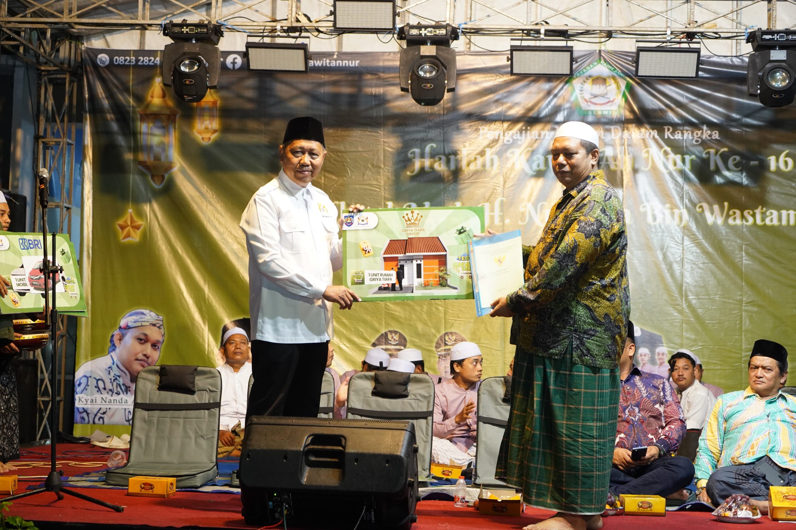 MENYERAHKAN: Pembina dan jajaran Yayasan Kawit An Nur, di Pondok Pesantren Kawit An Nur Slawi H Kasriyanto secara simbolis menyerahkan satu unit rumah untuk hadiah Tegal Great Sale, Minggu (4/1/2026) malam.