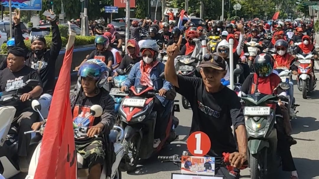 Di sepanjang perjalanan, ribuan massa pasukan banteng menyerukan kalimat ‘Nyawiji’ (Menjadi satu), pilih ‘Wonge Dewek’ (Orang sendiri) hingga coblos nomor siji (Satu).