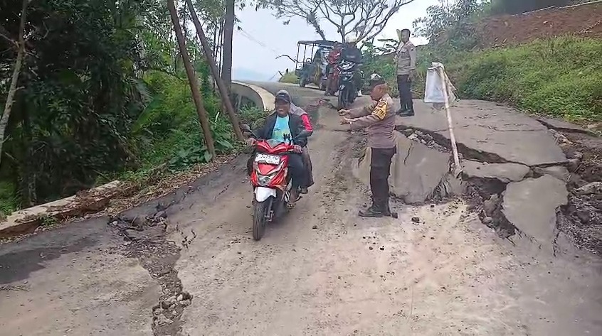 SLAWI, smpantura – Jalan Raya Batunyana-Danasari, tepatnya di Desa Gunungjati, Kecamatan Bojong, Kabupaten Tegal, amblas sekitar 1 meter sepanjang sekitar 20 meter setelah hujan deras pada Selasa (20/1/2026) malam. Jalan ini hanya bisa di lalui kendaraan roda dua, sedangkan kendaraan roda empat di alihkan.