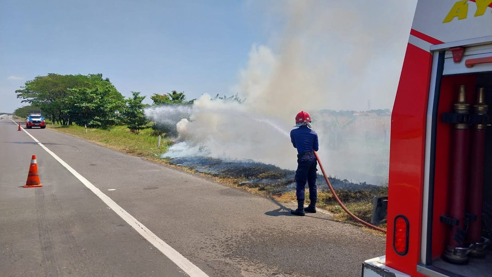 BREBES, smpantura – Kebakaran ilalang di tepi jalan tol rawan terjadi, terutama saat musim kemarau. Hal ini kerap menyebabkan jalan tol tertutup asap akibat kebakaran ini. Kondisi tersebut beberapa kali pernah terjadi di tol Pejagan-Pemalang. Bahkan ada yang berakibat fatal karena memicu kecelakaan.