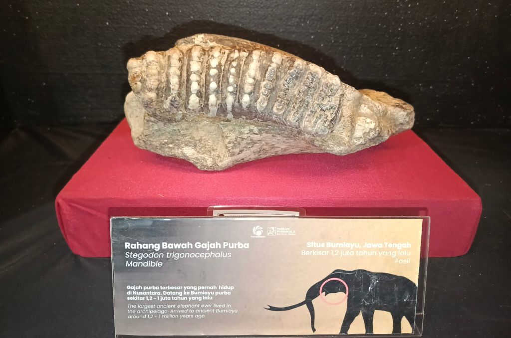 Selanjutnya adalah Stegodon trigonocephalus, gajah purba yang dikenal sebagai salah satu yang terbesar yang pernah hidup di kawasan Indonesia.