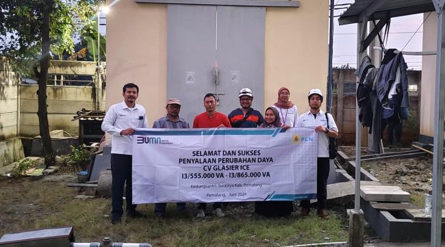 SLAWI, smpantura – Jelang perayaan Idul Adha, PLN Unit Pelaksana Pelayanan Pelanggan (UP3) Tegal terus mendorong perkembangan industri dengan penyalaan (tambah daya) listrik di perusahaan-perusahaan. Salah satunya perusahaan pembuatan es batu, CV Glasier Ice di Jalan Raya Slarang Surajaya Pemalang yang melakukan perubahan daya golongan tarif industri (I3) yang semula 555 KVA menjadi 865 KVA, Kamis (13/6/2024).