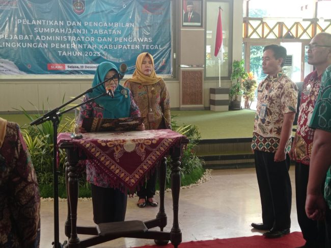 SLAWI, smpantura – Masa jabatan Bupati Tegal, Hj Umi Azizah berakhir pada 31 Desember 2023. Sebelum purna tugas, Bupati Umi melakukan penataan pejabat eselon III dan eselon IV dengan melantik 135 pejabat di Pendapa Amangkurat Pemkab Tegal, Selasa (19/12).