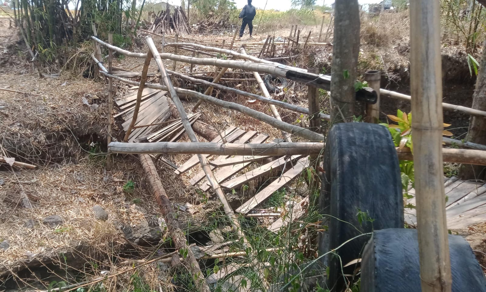 SLAWI, smpantura – Jembatan penghubung Dukuh Karangwareng, Desa Kabunan, Kecamatan Dukuhwaru, Kabupaten Tegal ambruk, beberapa waktu lalu. Jembatan yang terbuat dari batang kelapa sudah tidak bisa dilewati. Warga harus memutar jalan untuk bisa beraktivitas.