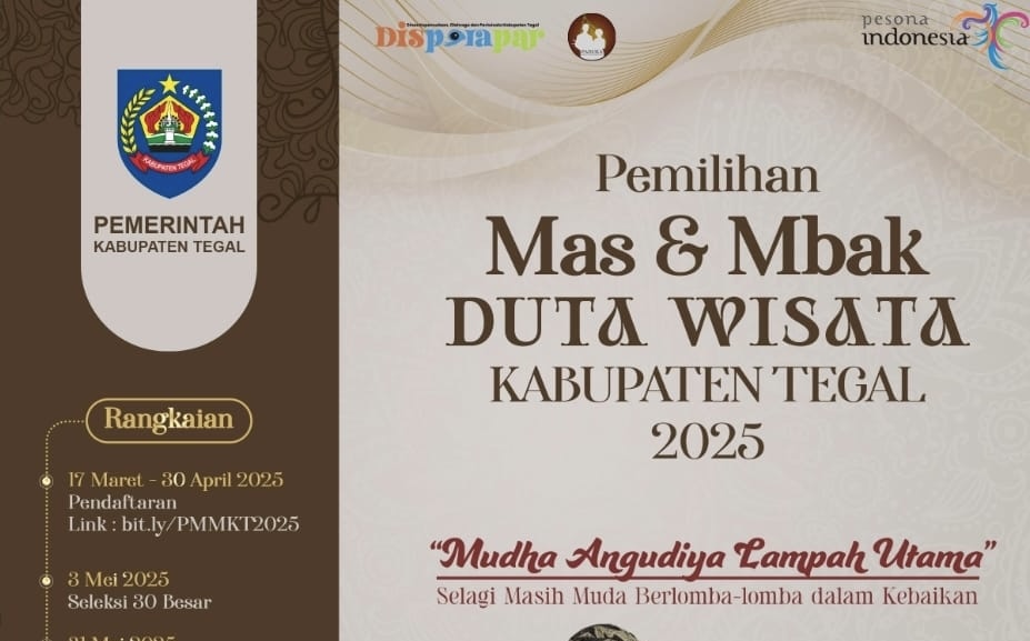 SLAWI, smpantura – Pemerintah Kabupaten Tegal melalui Dinas Kepemudaan, Olahraga, dan Pariwisata (Disporapar) kembali menyelenggarakan ajang bergengsi Pemilihan Mas Mbak Duta Wisata Kabupaten Tegal 2025.