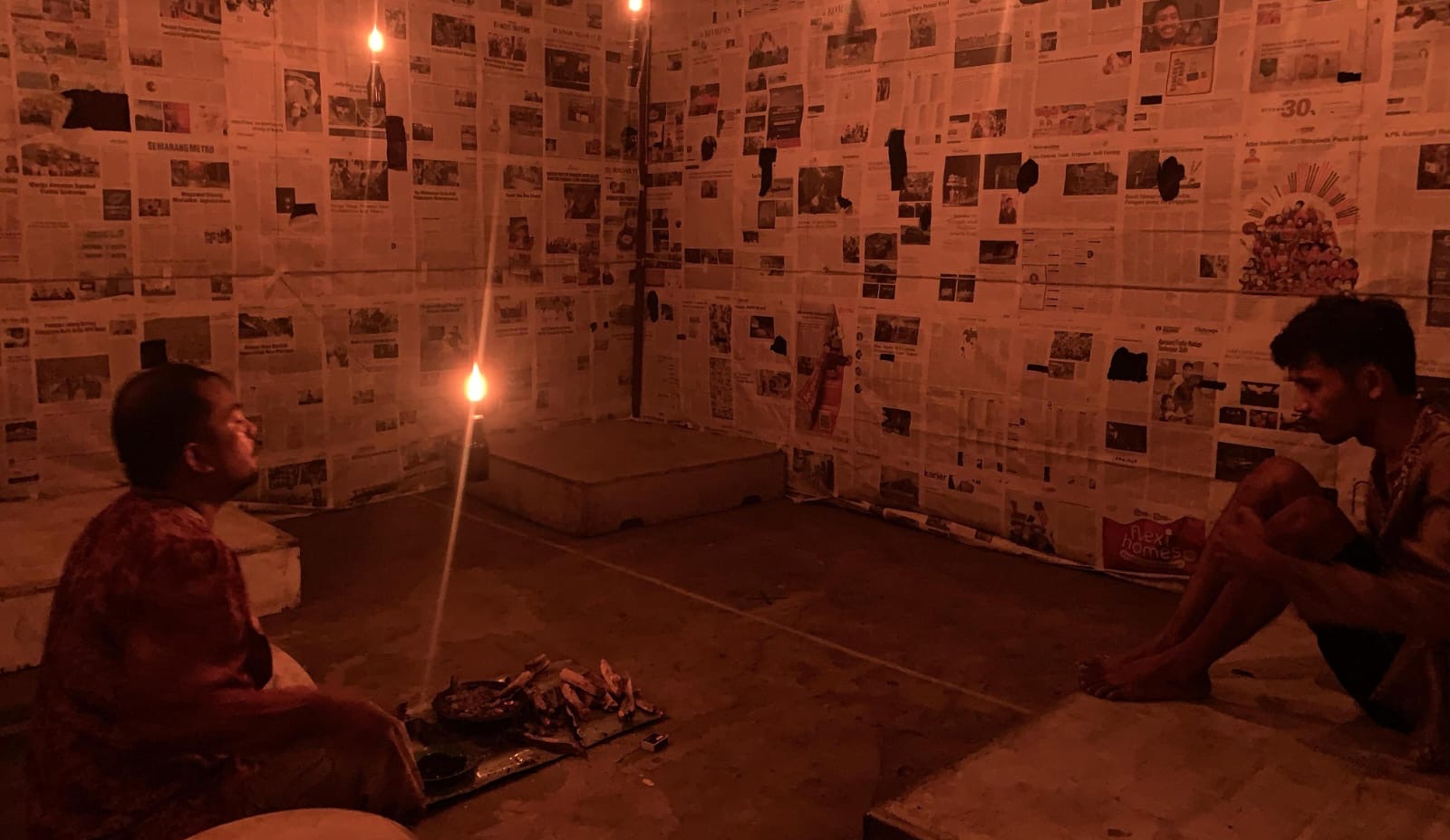 Dijelaskan dia, semua aktor bermain di dalam kubus berukuran 4×4 meter yang terbuat dari kertas koran. Untuk penonton dibuat melingkar.