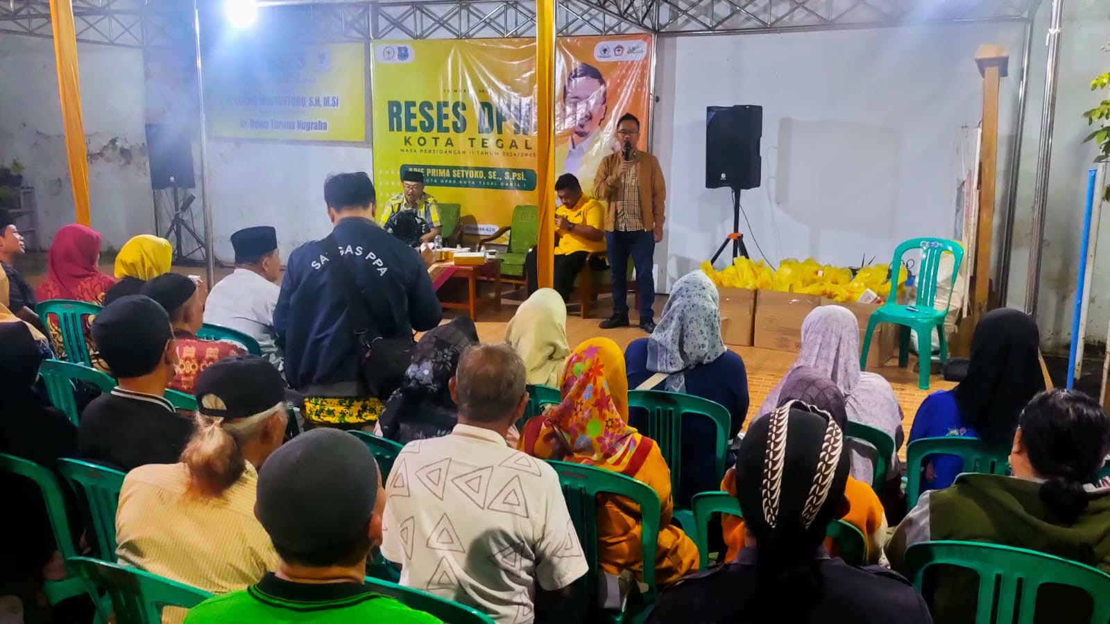 TEGAL, smpantura – Anggota Fraksi Golkar DPRD Kota Tegal, Arie Prima Setyoko, menggelar reses masa Persidangan II di halaman Kelurahan Mangkukusuman, Kecamatan Tegal Timur, Sabtu malam (15/3/2025).