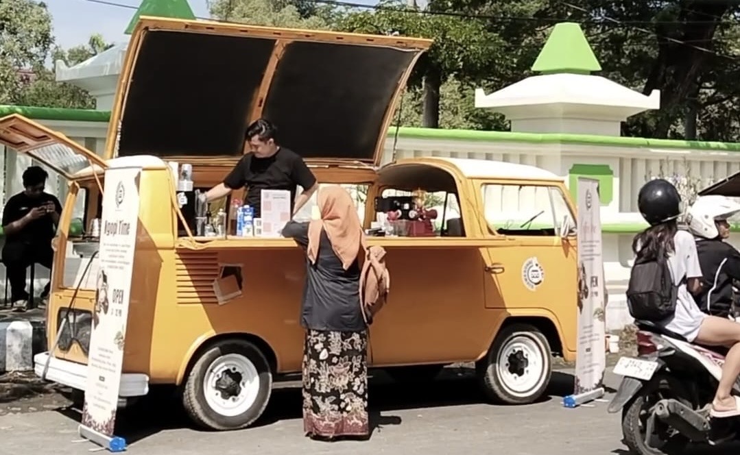 Saat melihat lebih dekat, sentuhan artistik dari mulai atap VW Combi yang dibuka, dan penataan meja ala kafe modern. Pintu belakang mobil juga dibuka membuat suasana kafe terlihat jelas.