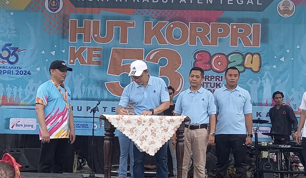 PKS ditandatangani oleh Sekretaris Daerah Kabupaten Tegal yang Ketua Dewan Pengurus Korpri Kabupaten Amir Makhmud dan Pemimpin Bank Jateng Cabang Slawi Setiyo Aji, disaksikan Pj Bupati Tegal Agustyarsyah dan Direktur PT Maris Bangun Nasional William Ardianto pada acara Puncak HUT ke-53 Korpri di Lapangan Pemkab Tegal, Minggu (8/12/2024).