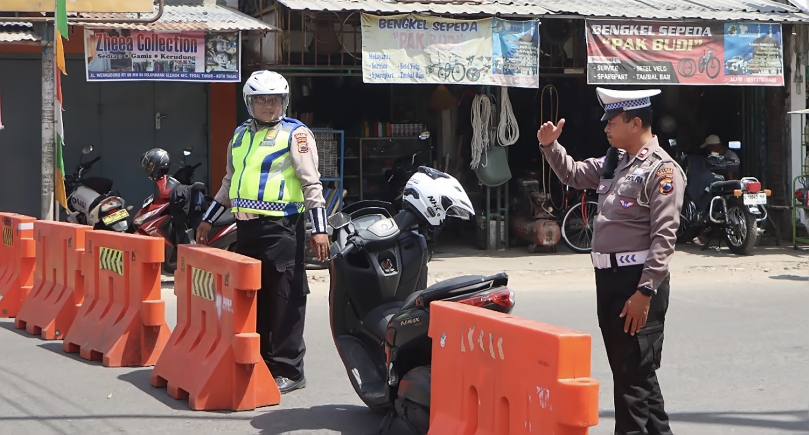 ”Saat mendaftar, pasangan calon (Paslon) Wali Kota dan Wakil Wali Kota Tegal, diiringi banyak pendukungnya, juga relawan. Karena itulah, demi kelancaran arus lalu lintas, arus lalin di depan KPUD Kota Tegal dibuat satu arah, dan dilakukan buka tutup jalur,” terang Kapolres Tegal Kota, didampingi Kabag Ops Kompol Nurcholis, Kasat Lantas AKP Agus Joko Guntoro dan Kasat Samapta AKP Bambang Sridiartono.