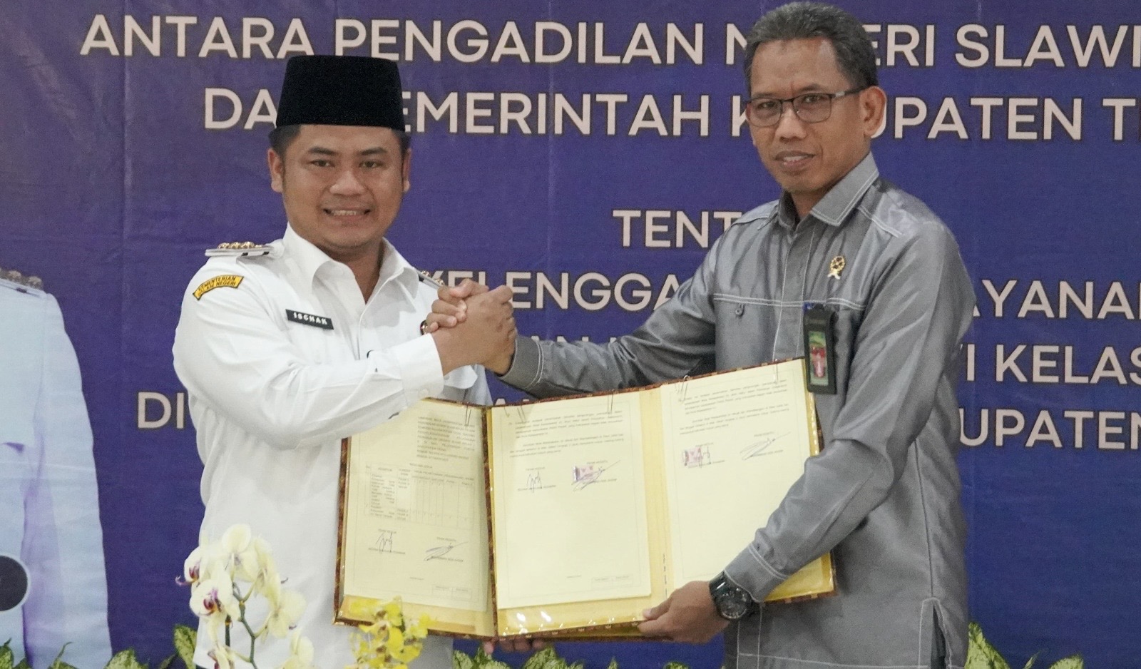 Secara resmi nota kesepakatan dan peresmian Layanan Pengadilan Negeri Slawi Kelas IB ditandatangani oleh Bupati Tegal Ischak Maulana Rohman dan Ketua Pengadilan Negeri Slawi Muhammad Adil Kasim di Mal Pelayanan Publik Satya Dahayu, Rabu (7/5/2025).