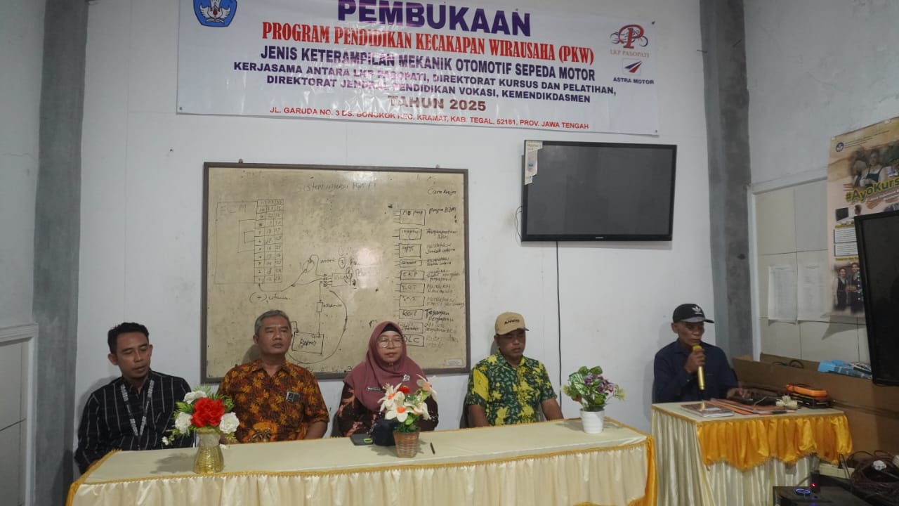 Dikatakan, program PKW Platinum yang digelar LKP Pasopati berupa Workshop Management Pengelolaan Usaha Rintisan Bengkel Sepeda Motor dilakukan di ruang belajar LKP Pasopati Jalan Garuda Nomor 03 Desa Bongkok RT 01 RW 02 Kecamatan Kramat, Kabupaten Tegal.