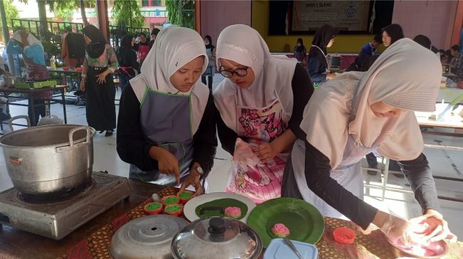 “Baru kali ini membuat kue ini,” tutur Alma siswi kelas XII.1 yang membuat kue awu khas Randudongkal, Pemalang, yang dimodifikasi menjadi bentuk bunga mawar.