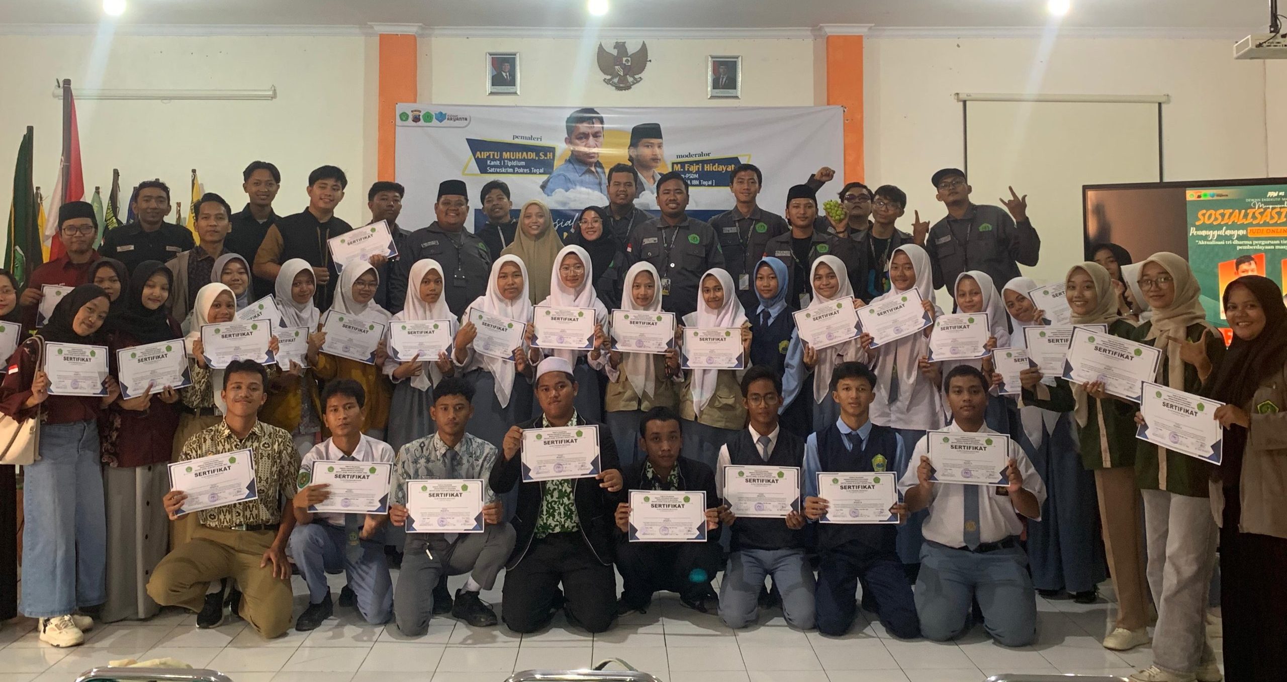 SLAWI, smpantura – Dewan Eksekutif Mahasiswa (DEMA) Institut Agama Islam Bakti Negara (IBN) Tegal menggelar Sosialisasi Peanggulangan Judi Online di Aula Kampus IBN Tegal, Kamis (19/12/2024). Sosialisasi yang dihadiri oleh perwakilan dari OSIS SMA/ SMK/ MA se-Kabupaten Tegal, dan masyarakat umum itu, memunculkan penyataan menarik dari para siswa.