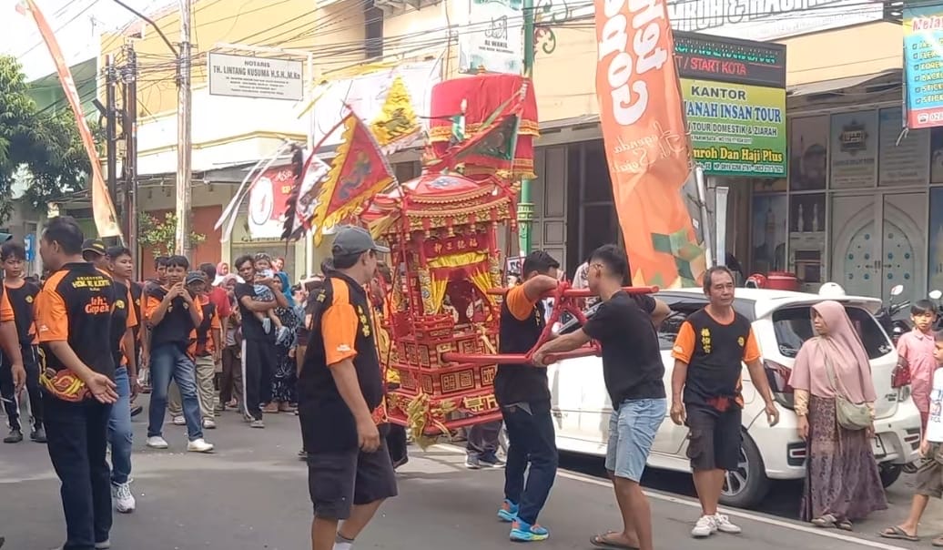 Prosesi kirab gotong toapekong pada Rabu (12/2/2025) dimulai pukul 12.45 dengan melakukan sembahyang bersama di depan tandu pembawa toapekong atau patung dewa yang akan diarak ke empat penjuru mata angin, Utara, Selatan, Timur dan Barat.