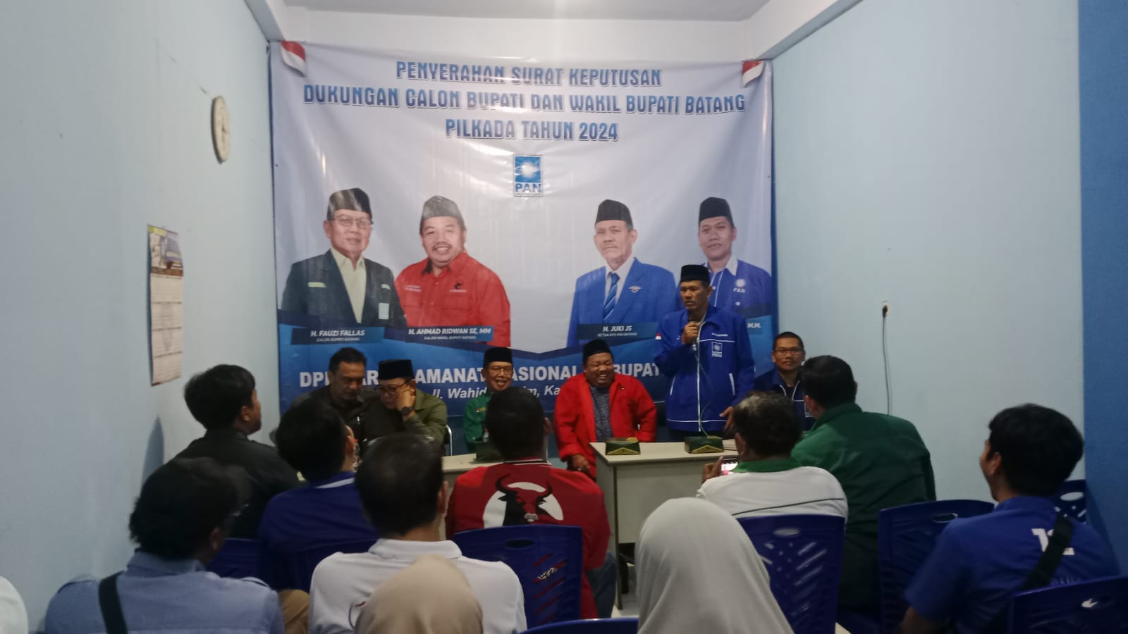 Dukungan PAN terhadap pasangan Fauzi Fallas dan Ahmad Ridwan ditandai dengan penyerahan Surat Keputusan (SK) oleh Ketua DPC PAN Batang, Juki, pada Senin (26/8).