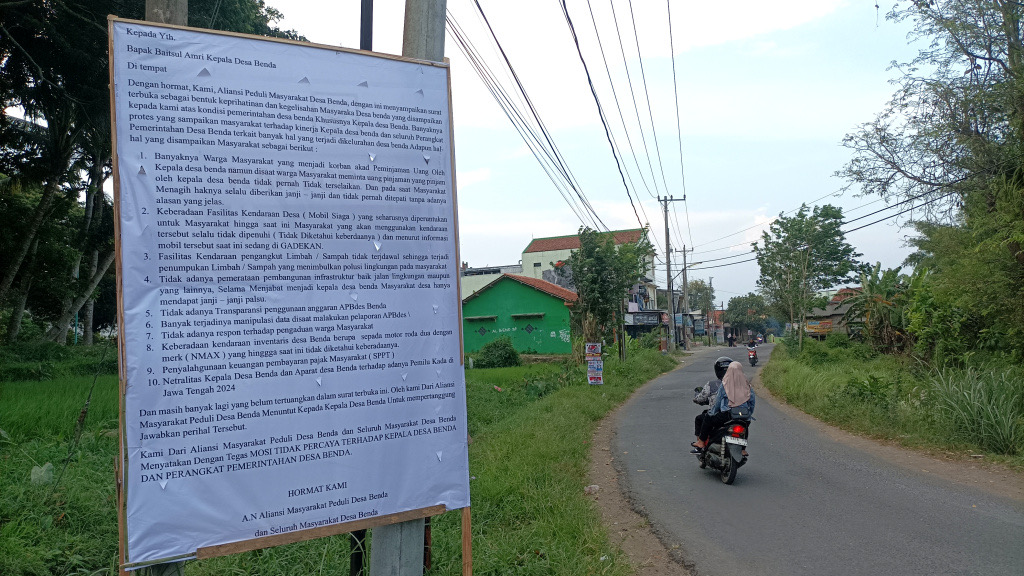Tuntutan tersebut disampaikan melalui baliho dengan tulisan surat terbuka untuk Kepala Desa Benda, Baitsul Amri, Selasa (22/10). Baliho itu dipasang di tiga lokasi, yaitu Dukuh Kratagan, pertigaan Dukuh Benda, dan tikungan Dukuh Bulakungu. Selain baliho, ada pula spanduk bertuliskan “Darurat Transparansi APBDes”.