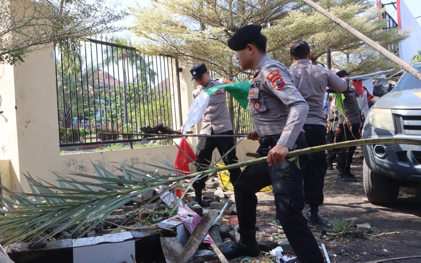 Antara lain, pagar pintu gerbang masuk dan keluar, mengalami kerusakan. Kemudian Pos Penjagaan juga porak poranda.