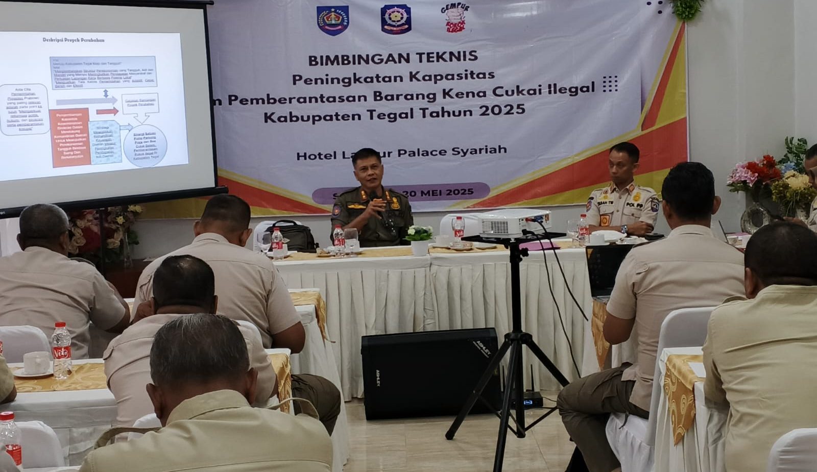 SLAWI, smpantura – Pasukan Satuan Polisi Pamong Praja (Satpol PP) Kabupaten Tegal digembleng cara mendeteksi rokok ilegal saat Bimbingan Teknis Peningkatan Kapasitas Tim Pemberantasan Rokok Ilegal Tahun 2025 di Meeting Room Hotel Lasnur Palace Syariah Slawi, Senin-Selasa (19-20/5/2025).
