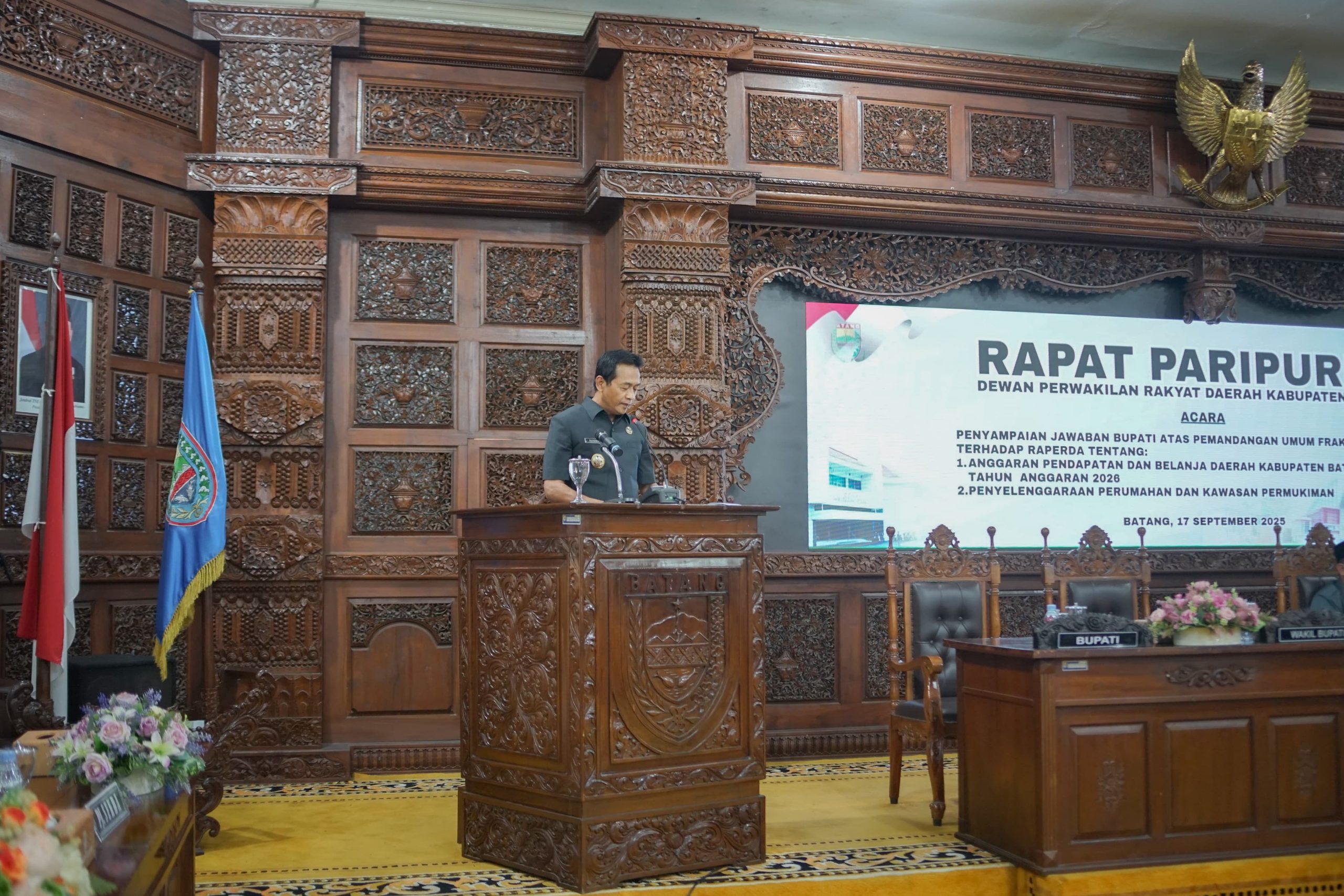 Demikian disampaikan Wakil Bupati Batang Suyono dalam Rapat Paripurna DPRD Batang dengan agenda Penyampaian Jawaban Bupati Batang Atas Pemandangan Umum Fraksi – Fraksi DPRD Batang terhadap Raperda tentang APBD Kabupaten Batang Tahun 2026 dan Raperda tentang Penyelenggaraan Perumahan dan Kawasan Permukiman, Rabu (17/9).